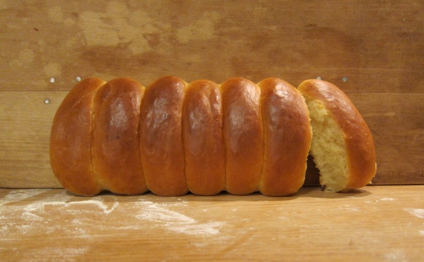 Wir machen also einen Hefeteig mit Zucker, Ei und Butter. Formen kleine Stränge daraus, streichen sie mit Milch ab und schieben sie in den Ofen.
