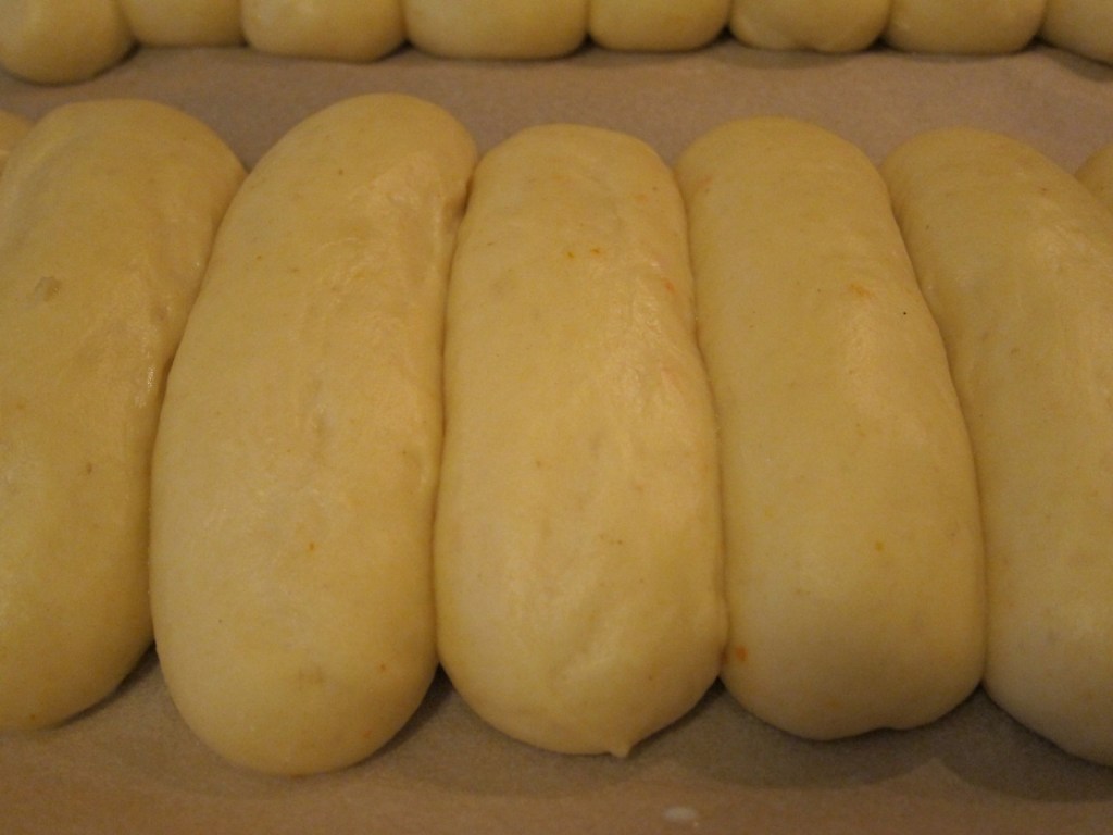 Anschließend legen wir die Teigwürste in eine, bzw parallel in zwei Reihen hintereinander auf ein Backblech mit Trennpapier. Dabei lassen wir zwei Millimeter Abstand zwischen den Strängen.
