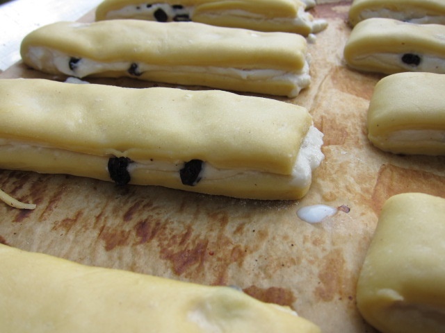 Später wird der Teig nur noch zu einem Flecken auseinander gezogen, etwa 28cm auf 24cm und die untere Hälfte mit 150g der Puddingcreme bestrichen. Wer mag, lässt es Rosinen darauf regnen oder Schokodrops. Dann die obere Hälfe auf die untere umschlagen und den Flecken in Streifen schneiden, 3 cm breit. Bei der Teigmenge müsste das etwa 8 bis 9 Stück ergeben.