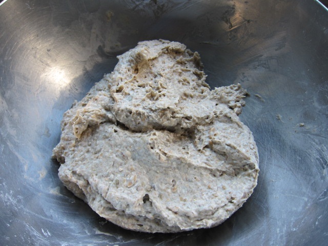Aus dem Anstellgut, Roggenschrot, Salz und dem warmen Wasser rühren wir einen Brei. Den lassen wir über Nacht für mindestens 12 Stunden ruhen.