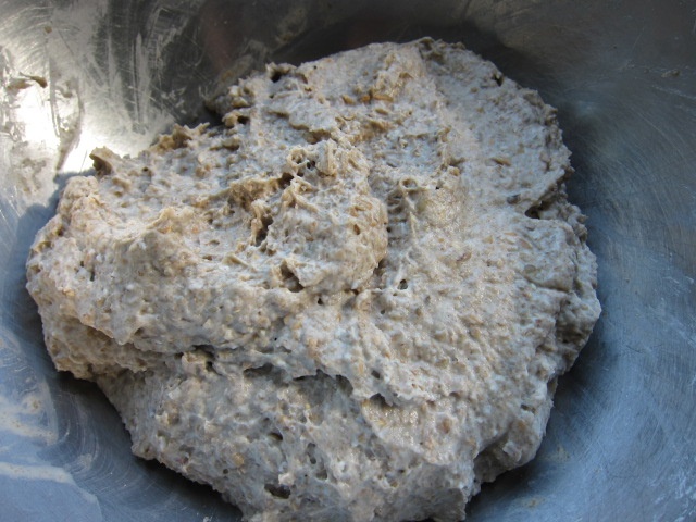 So gemischt lassen wir den Teig 45 Minuten ruhen. Mehl und Wasser verquellen miteinander. Stärke, Ballaststoffe und Eiweiße werden von den Enzymen des Mehls abgebaut zu Zucker. Den verstoffwechseln die Hefen später und lassen den Teig aufgehen. Sollte der Teig zu feucht sein, machen wir die Hände nass, schlagen den Teig einmal locker zu einem Rechteck zusammen und legen ihn in eine geölte Backform. Meine ist etwa 21cm lang, 11 cm breit und 7 cm hoch. Auf die Teigoberfläche lassen wir es etwas Mehl regnen und verstreichen es.