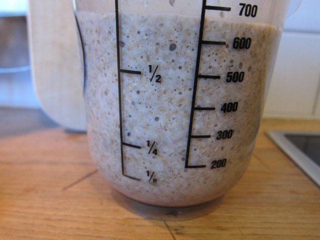 Samstagabend, zwei Stunden geschlafen. Wir nehmen einen Teil des Sauerteigs und setzen einen neuen Teig damit an. Das Gefäß mit dem restlichen Sauerteig stellen wir zurück in den Kühlschrank.