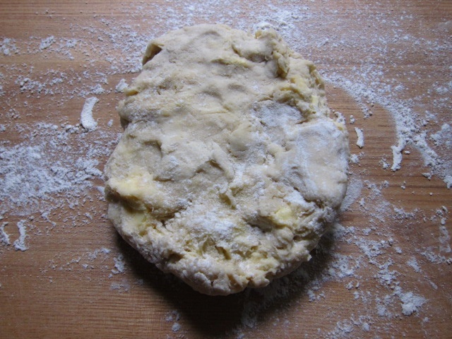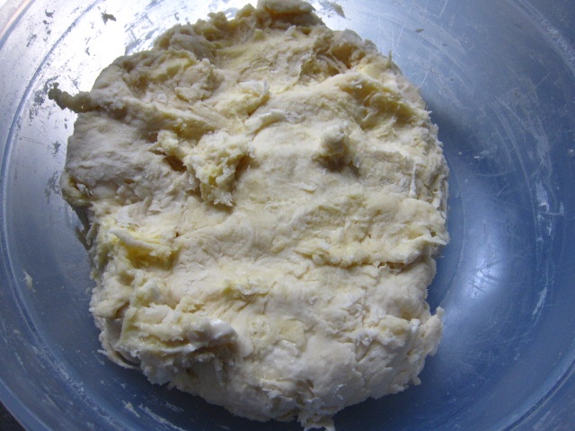 Mehl, Wasser und Butter zu einem groben Batzen mischen, keinesfalls zu lange kneten. Für mindestens zwei Stunden in den Kühlschrank stellen. Oder gar über Nacht. Nicht erschrecken ob der Optik des Teiges. Es handelt sich mehr um ein Mehl-Butter-Gemisch.