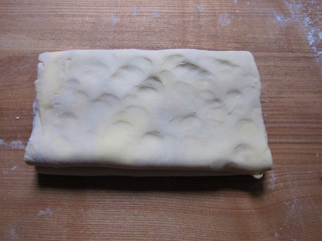 Ist der Teig gut durch gekühlt, beginnen wir mit dem Tourieren. Dabei wird der Teigbatzen wiederholt mit dem Rollholz in die Länge gerollt und nach Art eines Geschäftsbriefes gefaltet und zusammen gelegt. Nach und nach wird aus dem anfangs unförmigen Klumpen ein geschlossener Teig. Es bilden sich feine Schichten aus Teig und Butter, die nach dem Backen zartsplittrig auseinander blättern.