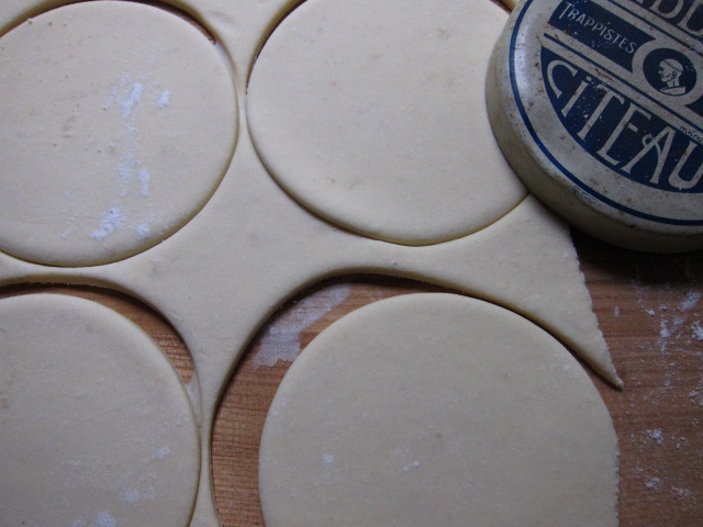 Der Teig ist fertig touriert und lag noch einmal für eine Stunde im Kühlschrank. Nun rollen wir ihn aus zu einem Rechteck, etwa 50 cm auf 30 cm, etwa 2mm dick. Anschließend Kreise ausstechen. Mein Ausstecher – der Deckel einer Dose – hat einen Durchmesser von 15cm. Damit steche ich 6 Kreise aus. Die Teigreste legen wir zusammen. Rollen sie aus und stechen nochmal einen Kreis aus.