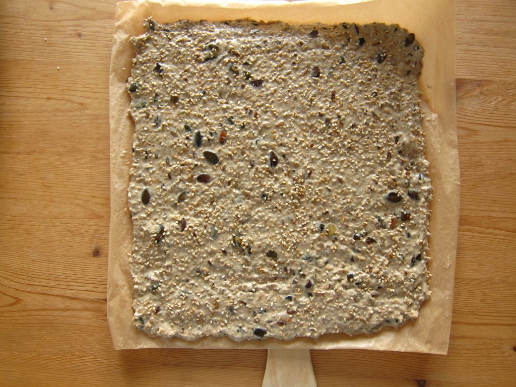 So ist es. Und trotzdem hatte ich die Tage mal wieder Lust, Knäckebrot zu backen. Es eignet sich ganz gut als Notreserve oder als Snackunterlage für zwischendurch. Am besten schmeckt es mir allerdings frisch aus dem Ofen auf die Hand. Dabei läßt sich der Teig erfindungsreich verändern. Wer es kerniger mag, schmuggelt ein Quellstück aus Saaten in den Teig. Oder man ersetzt ein Teil des Mehls durch Schrot oder alte Getreide wie den Emmer.