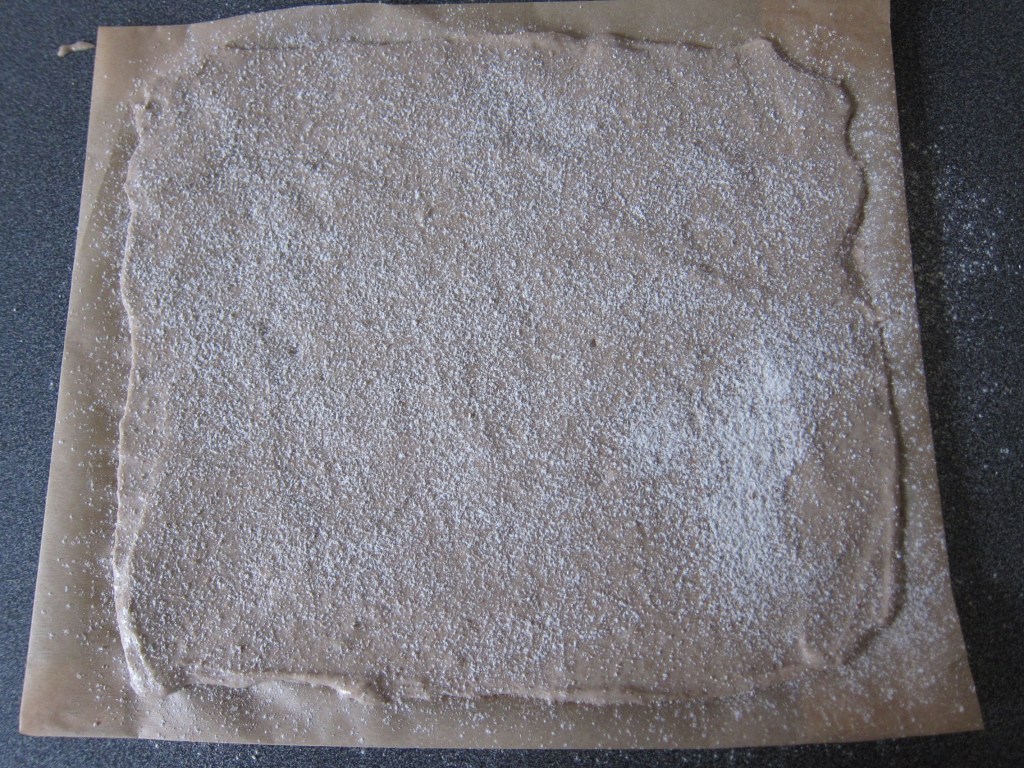 - etwa 2mm dünn auf ein Backpapier aufstreichen. Den Teig noch einmal für etwa 90 bis 120 Minuten gehen lassen. Hin und wieder mit kurzen Stößen aus der Sprühpistole feucht halten, damit die Oberfläche nicht zu sehr antrocknet