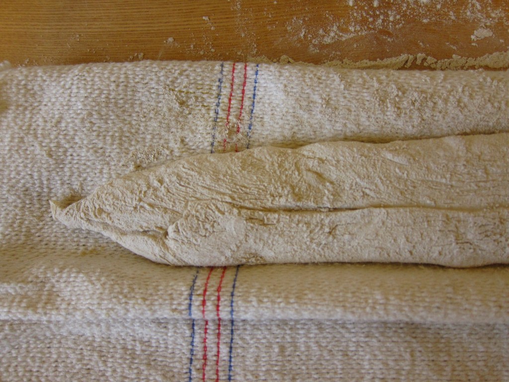 Nach einer kurzen, Zwischengare genannten, Phase der Entspannung, rollt man den Teigling möglichst schonend auf etwa 30 Zentimeter aus und läßt ihn, entweder eingeschlagen in ein Tuch oder so auf dem Tisch, noch einmal 15 bis 20 Minuten liegen.