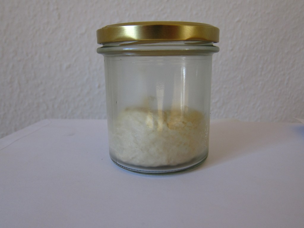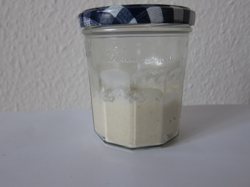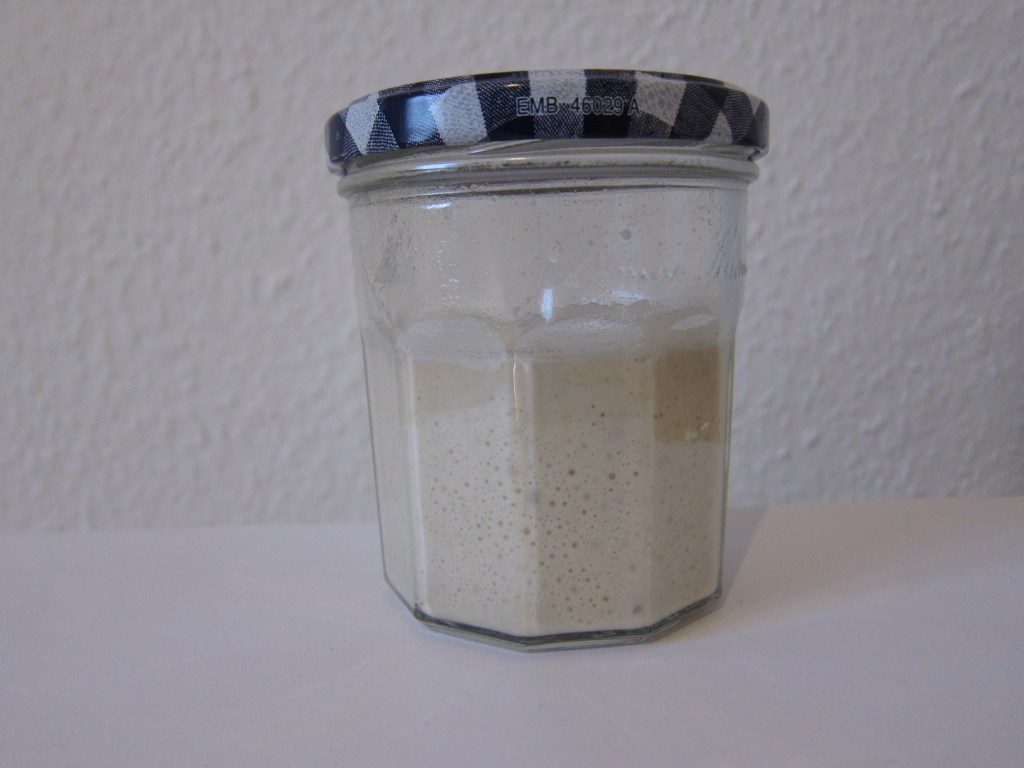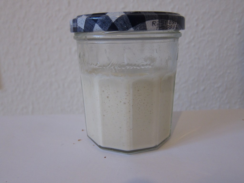 Das macht man ein paar Mal nacheinander und nimmt dazu stets einen kleinen Teil des vorigen Ansatzes als Anstellgut weg. Es wird also nur ein Mal mit Roggenanstellgut angeimpft, und dann immer ein Teil der neuen Weizenkultur zum Weiterführen genommen.