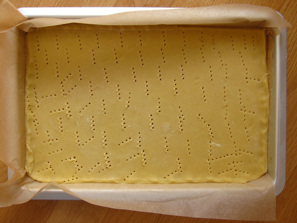 Ein tiefes Backblech, etwa der Größe 25 x 30 cm und zwei bis drei Zentimeter tief, mit einem Backpapier auslegen. Den Mürbteig auf die Größe ausrollen und auf das Blech legen. Den Teig auch in die Ecken drücken und überstehende Ränder abschneiden. Mit der Gabel Löcher in den Teig stechen, damit Luft während des Backens aus dem Teig entweichen kann.