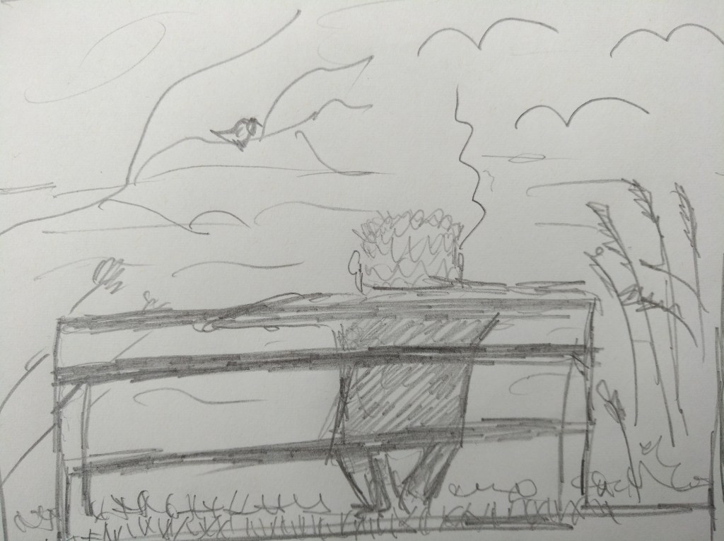 An der Iller, bei Lautrach. Die Knochen müde, erschöpft. Gut ist es da, auf der Bank zu sitzen, auf dem Damm. Im Herbst die Bauern geschäftig, Mähdrescher, Traktoren mit großen Anhängern – das Heu einbringen. Träge dagegen der Fluss vor dem Stausee. Plötzlich ein Vogel dicht über dem Wasser, orange und blau schimmernd – ein Eisvogel.