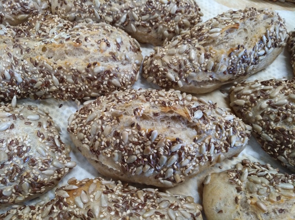 Die Brötchen sind gemacht aus drei Getreiden – Weizen, Dinkel und Roggen. Und tragen ein Quellstück aus Sesam, Leinsamen und Sonnenblumen in sich. Dazu ein Brühstück aus Grieß und Wasser. Das macht sie saftig und hält sie frisch auch für den nächsten Tag.